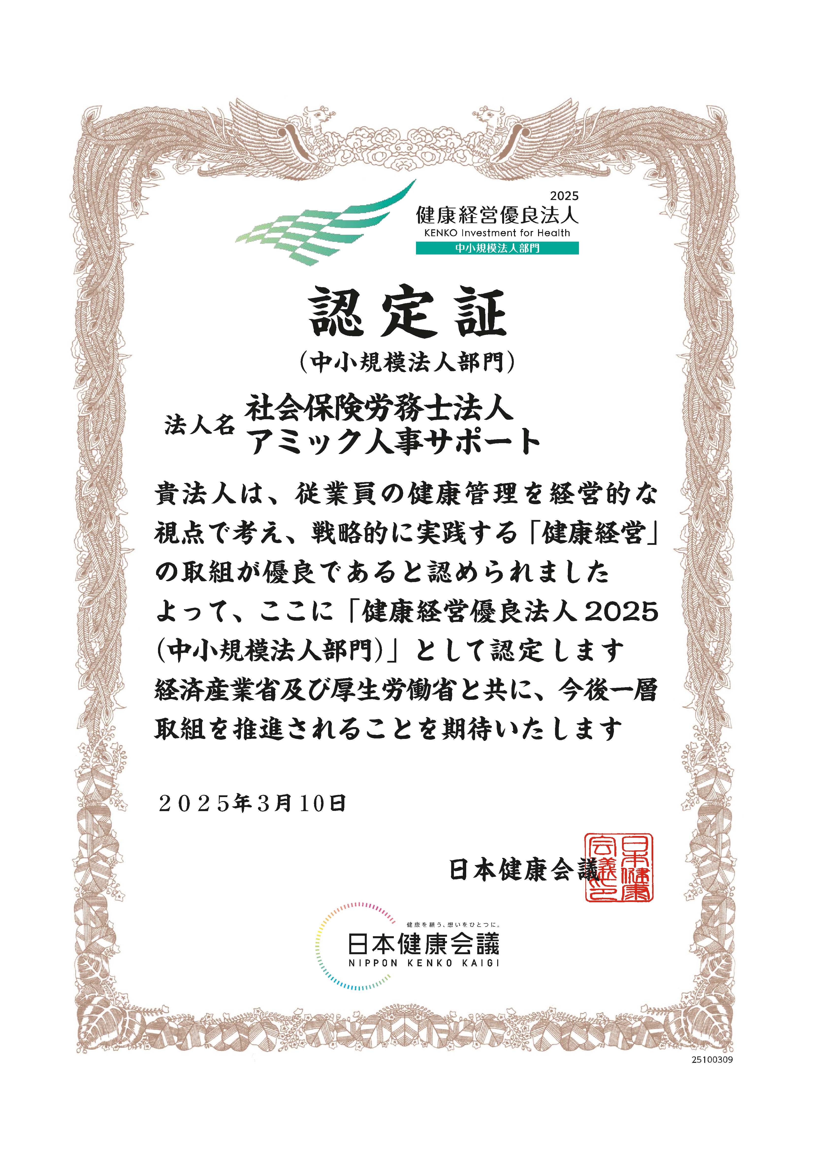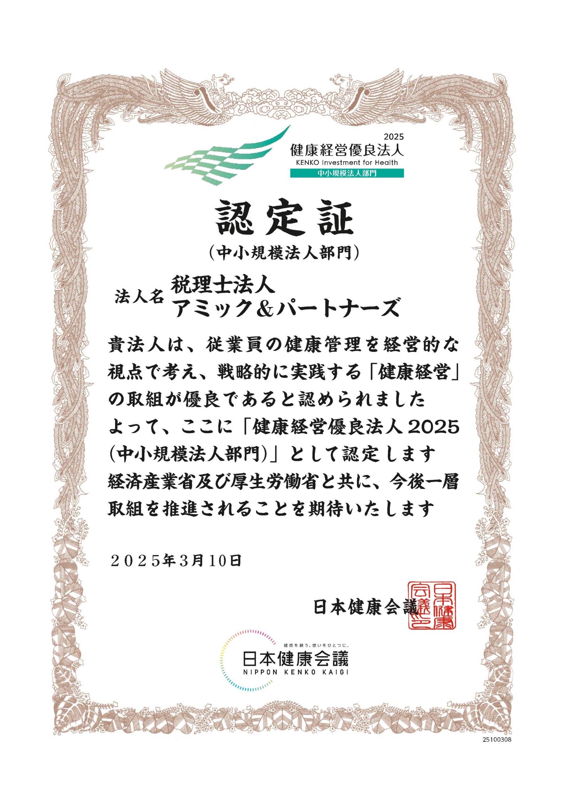 健康経営優良法人2025 経済産業省と日本健康会議が進める健康経営優良法人制度において、 「健康経営優良法人2025 ( 中小規模法人部門 ) 」 に認定